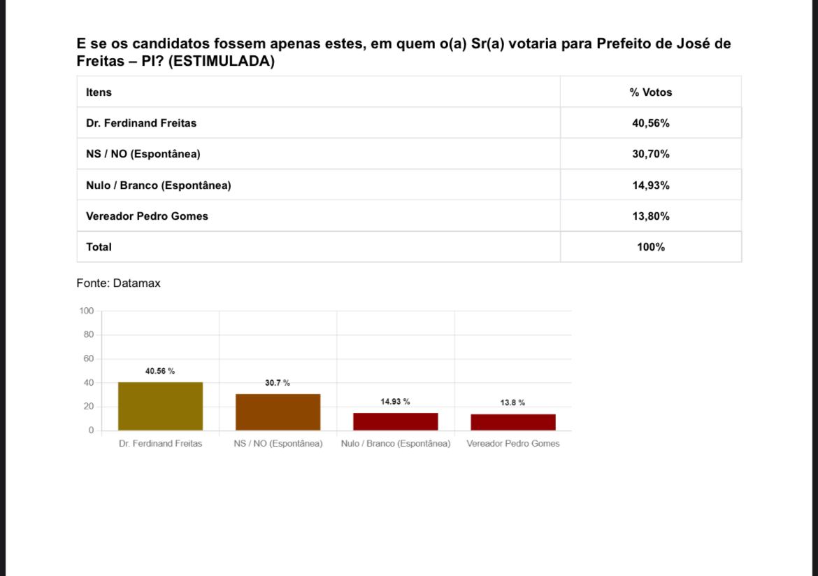 Uma pesquisa eleitoral recente, conduzida pelo respeitado Instituto DataMax, trouxe dados importantes em confrontos diretos, entre pré-candidatos a Prefeitura de José de Freitas.