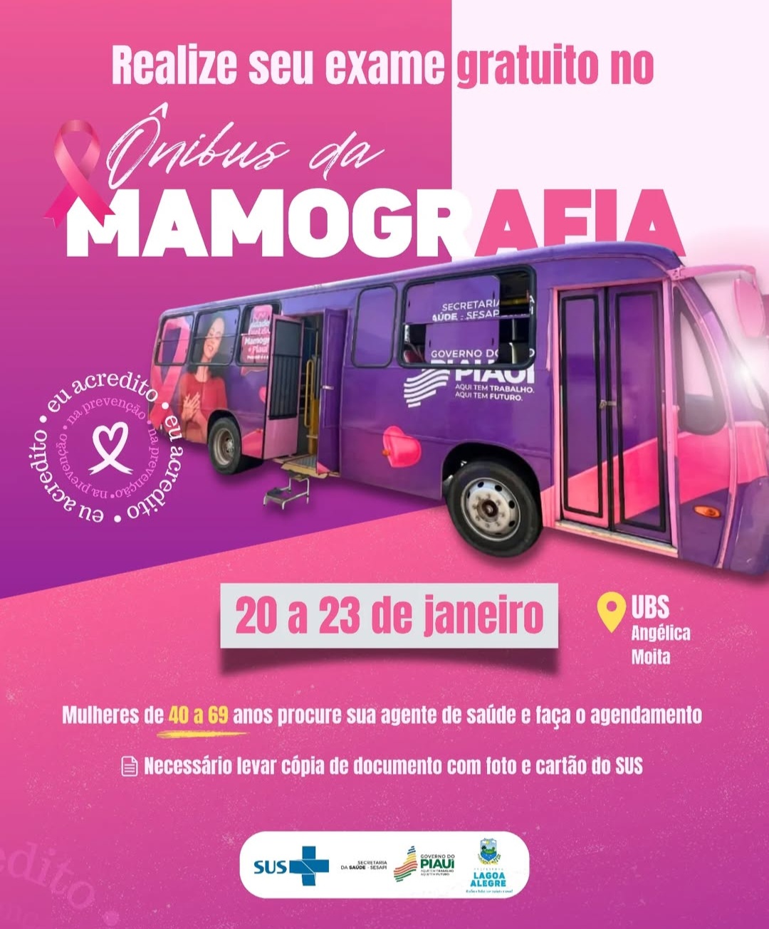 A Prefeitura de Lagoa Alegre, em parceria com o Governo do Estado do Piauí, convida as mulheres do município a participarem de uma importante ação de prevenção ao câncer de mama. De 20 a 23 de janeiro, um ônibus itinerante estará disponível para realizar exames gratuitos de mamografia, na frente da UBS Angélica Moita.