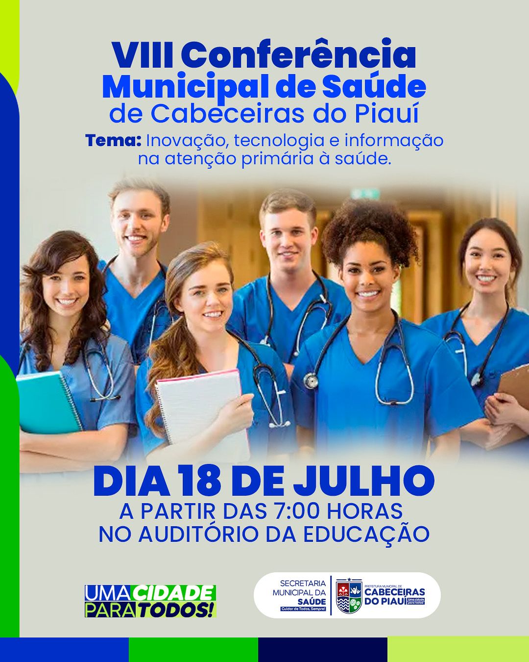 A Prefeitura de Cabeceiras do Piauí, por meio da Secretaria Municipal de Saúde, convida toda a população para participar da VIII Conferência Municipal de Saúde, que acontecerá no próximo dia 18 de julho, a partir das 7h, no Auditório da SEMED.