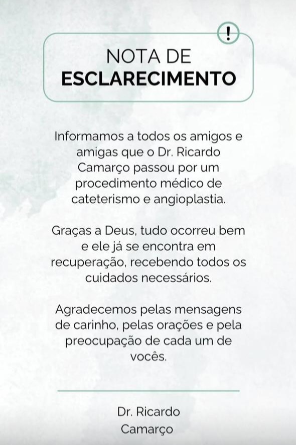 A família de Ricardo Camarço agradeceu as mensagens de carinho e preocupação recebidas durante este momento delicado e reforçou que sua saúde evolui de forma positiva.