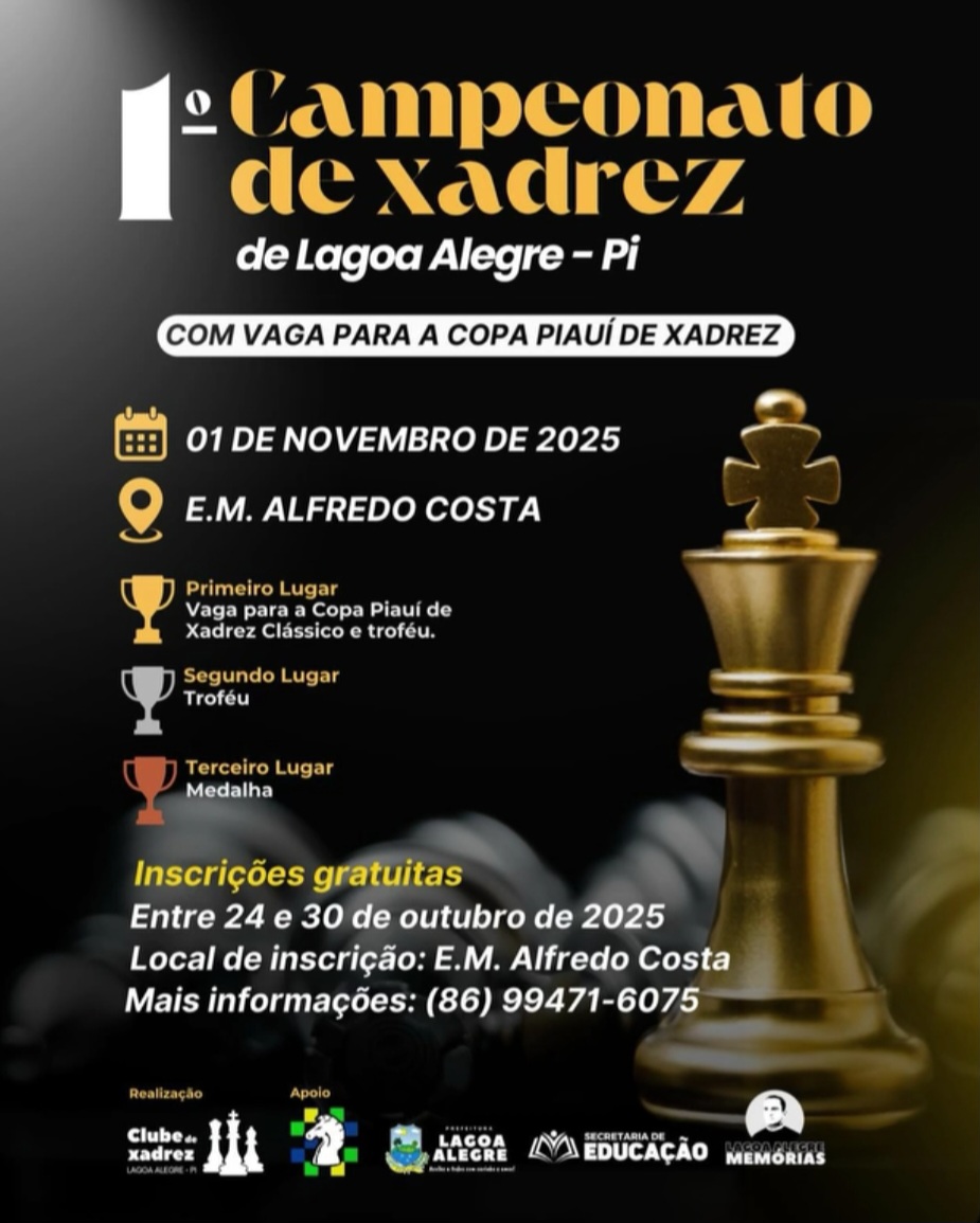 Lagoa Alegre se prepara para receber uma competição inédita no município: o 1º Campeonato de Xadrez de Lagoa Alegre – PI, que promete reunir talentos locais e amantes do esporte da mente. O evento acontecerá no dia 1º de novembro de 2025, na Escola Municipal Alfredo Costa.