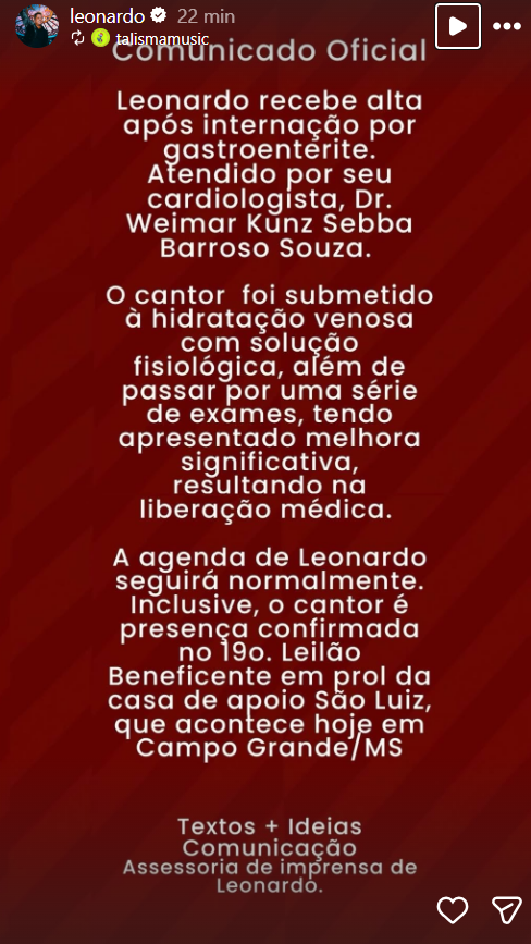 A notícia foi divulgada pelas redes sociais de sua esposa, a influenciadora Poliana Rocha, que mostrou o artista já em casa e bem-disposto. Em mensagem aos fãs, Leonardo agradeceu o carinho recebido e explicou, com bom humor, que o problema intestinal causou desidratação e câimbras, levando-o a procurar atendimento médico.