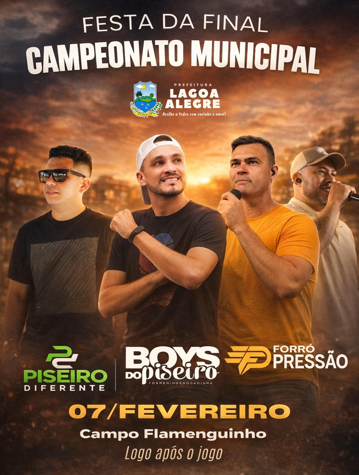 O encerramento da competição acontece no dia 07 de fevereiro, no Campo do Flamenguinho, e logo após o apito final, a Prefeitura garante uma noite de muita animação, forró e piseiro, do jeito que o povo lagoa-alegrense gosta.