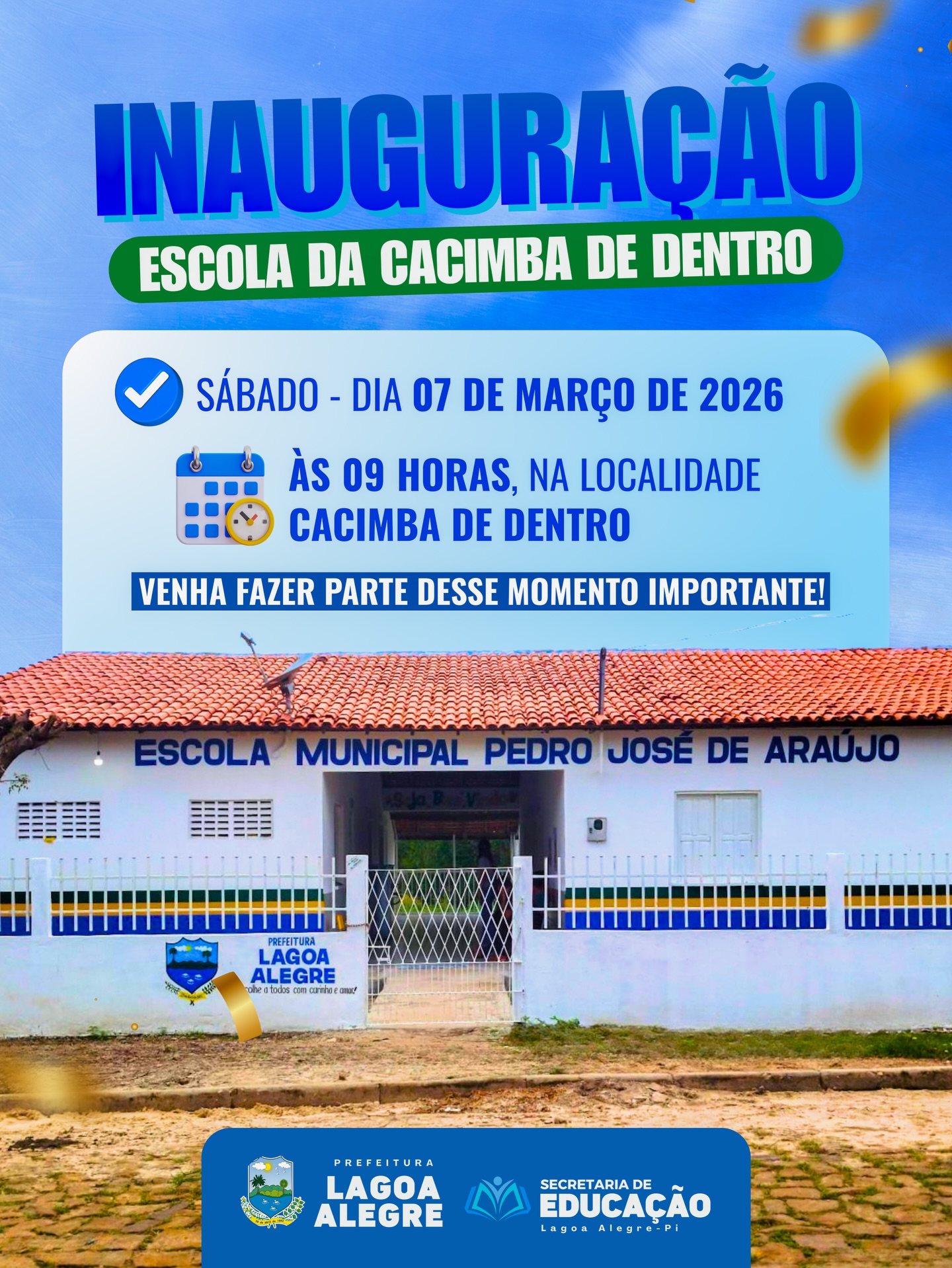 A gestão municipal convida toda a população para participar da inauguração e prestigiar esse momento importante para a educação de Lagoa Alegre.