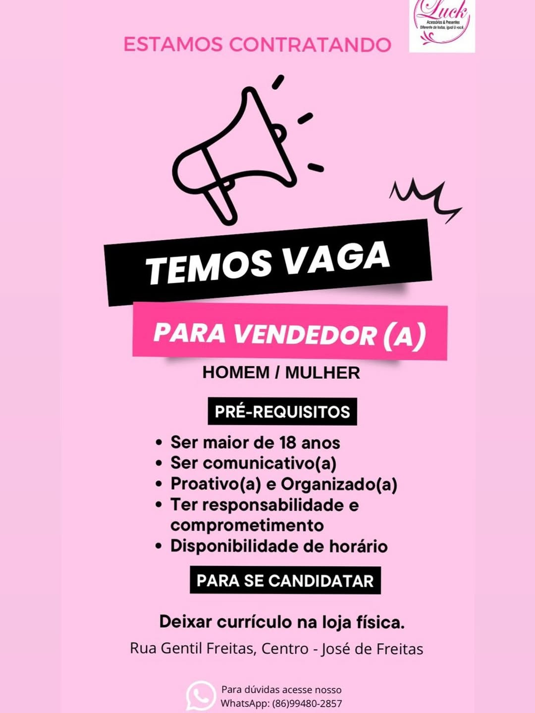 A loja Luck Acessórios está com vaga aberta para vendedor(a) em sua unidade localizada no centro de José de Freitas. A oportunidade é destinada tanto para homens quanto para mulheres, com idade mínima de 18 anos.