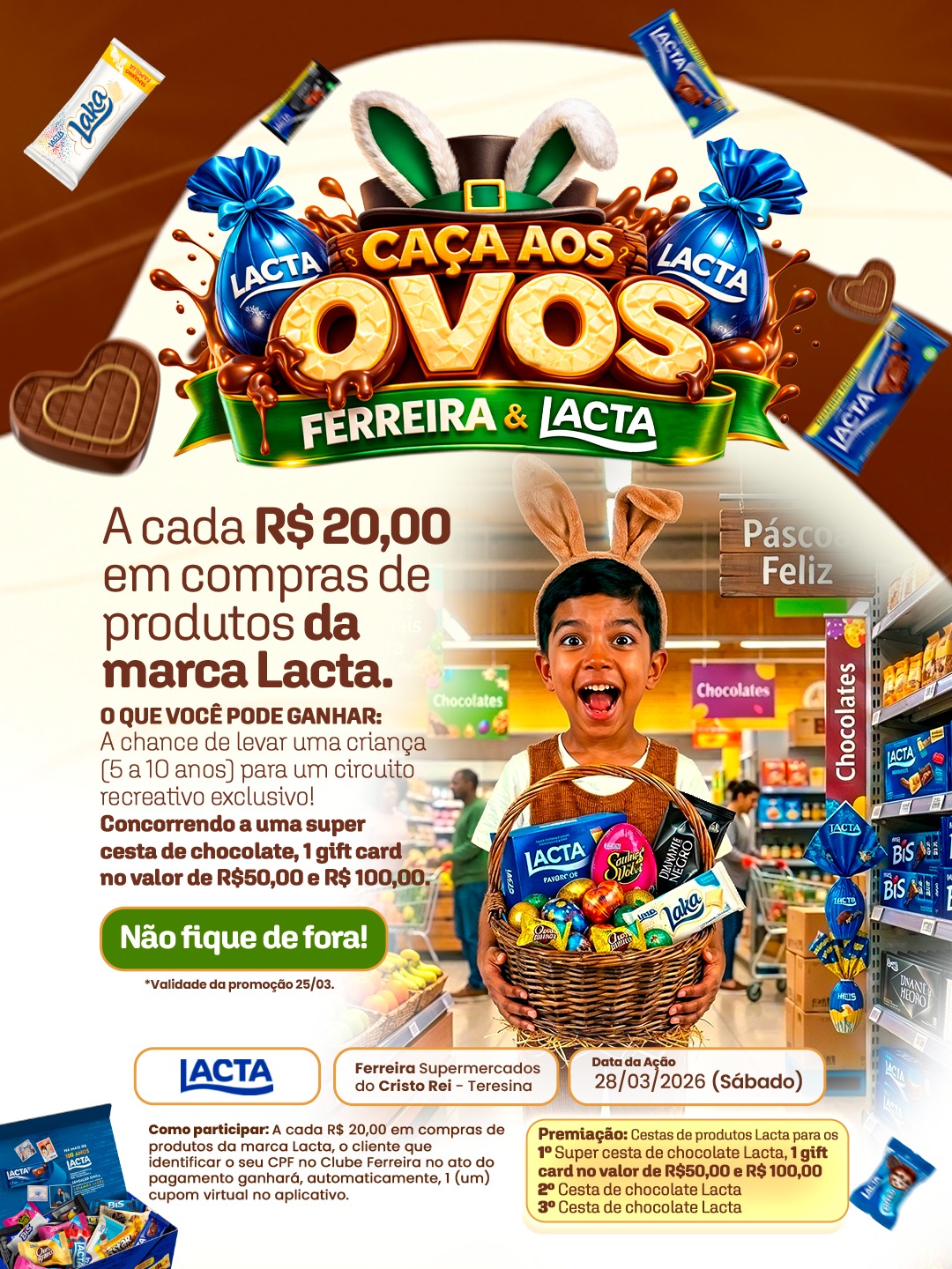 A campanha reforça o papel do Ferreira Supermercados como o destino principal para quem busca qualidade e o melhor preço na região. Antecipe suas compras, garanta seus ovos de Páscoa e itens para o almoço de domingo e, claro, não esqueça de passar seus produtos Lacta no caixa para validar sua participação.