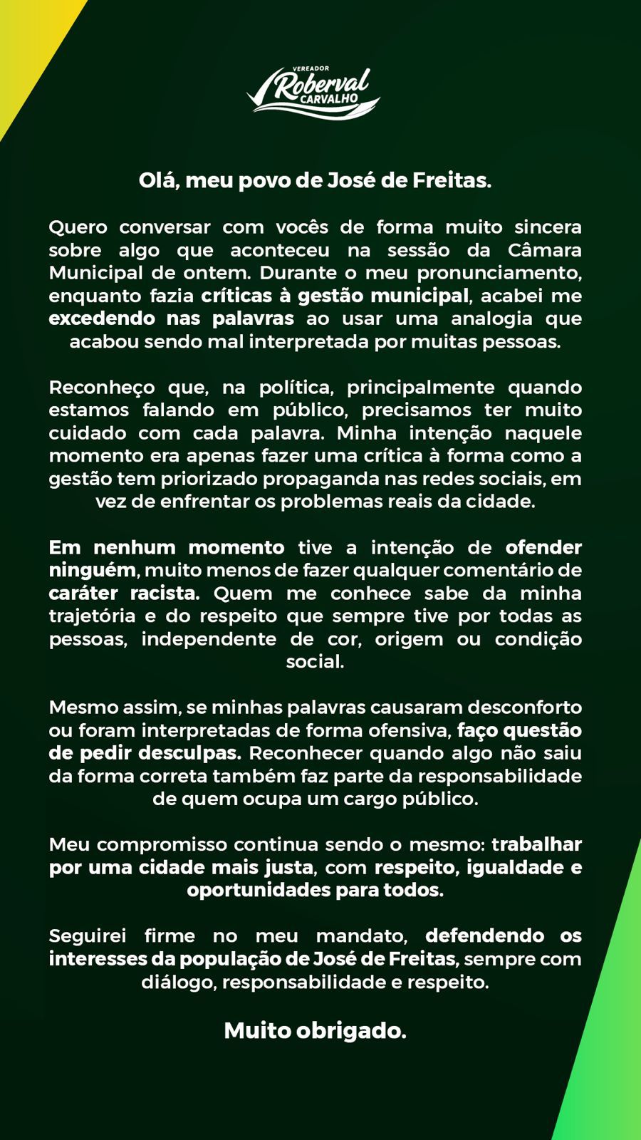Vereador Roberval Carvalho emite nota de esclarecimento e pede desculpas à população de José de Freitas