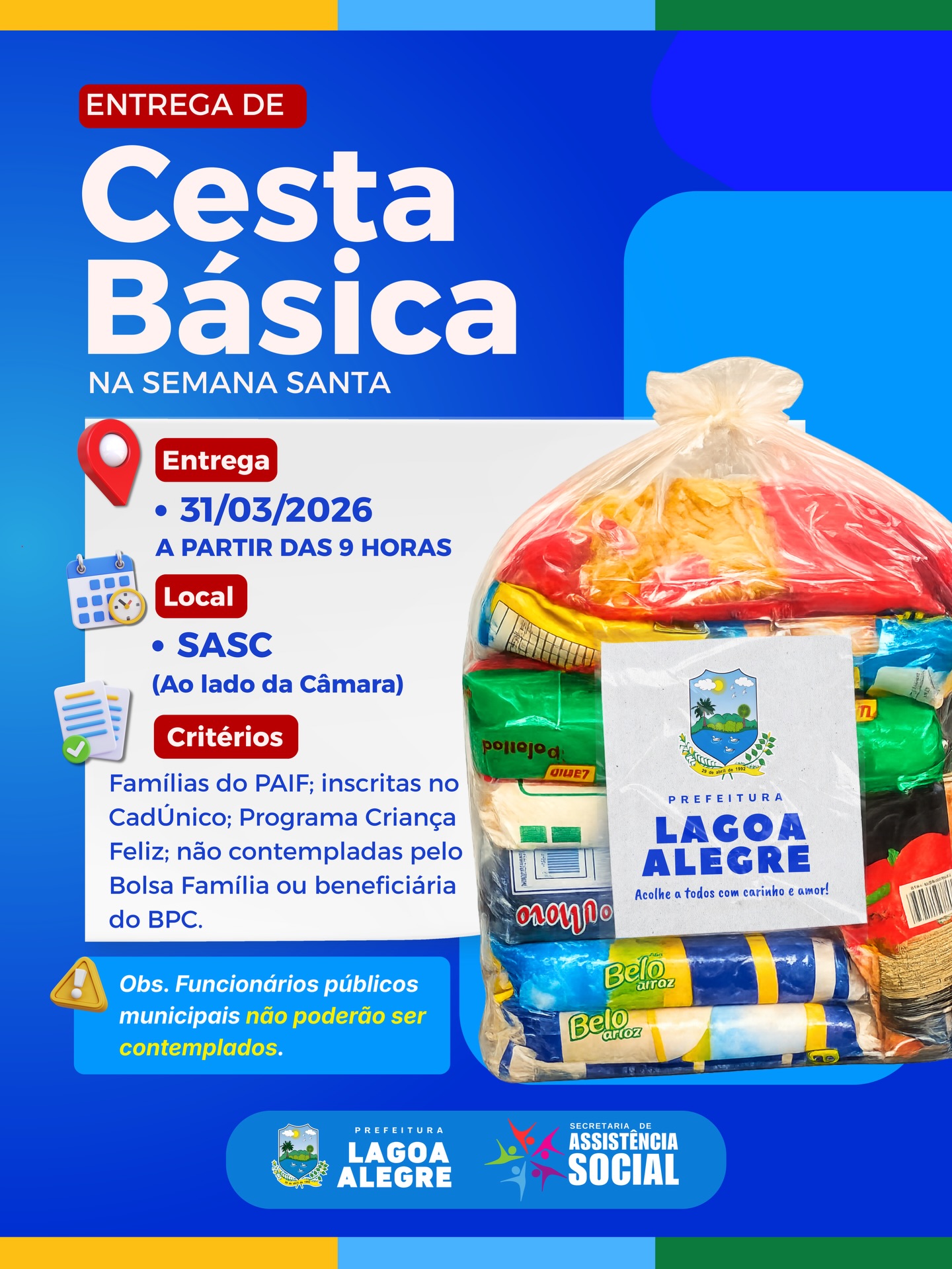 A Prefeitura Municipal de Lagoa Alegre, por meio da Secretaria de Assistência Social, realiza nesta terça-feira, 31 de março, a entrega de cestas básicas destinadas às famílias em situação de vulnerabilidade socioeconômica no município.