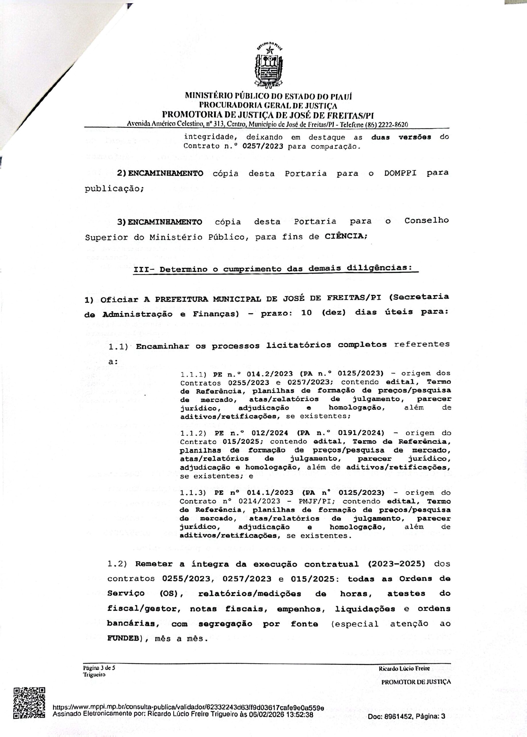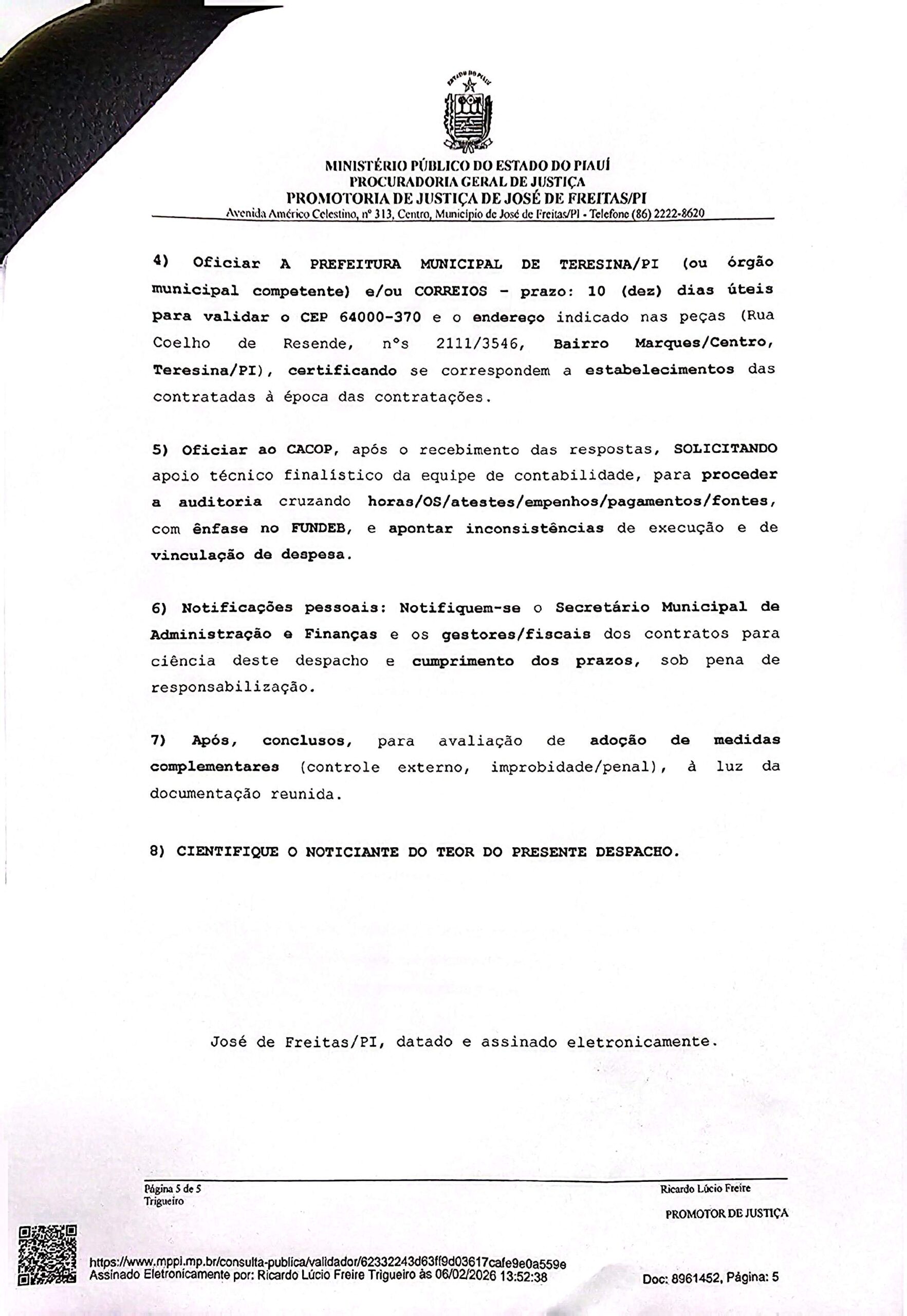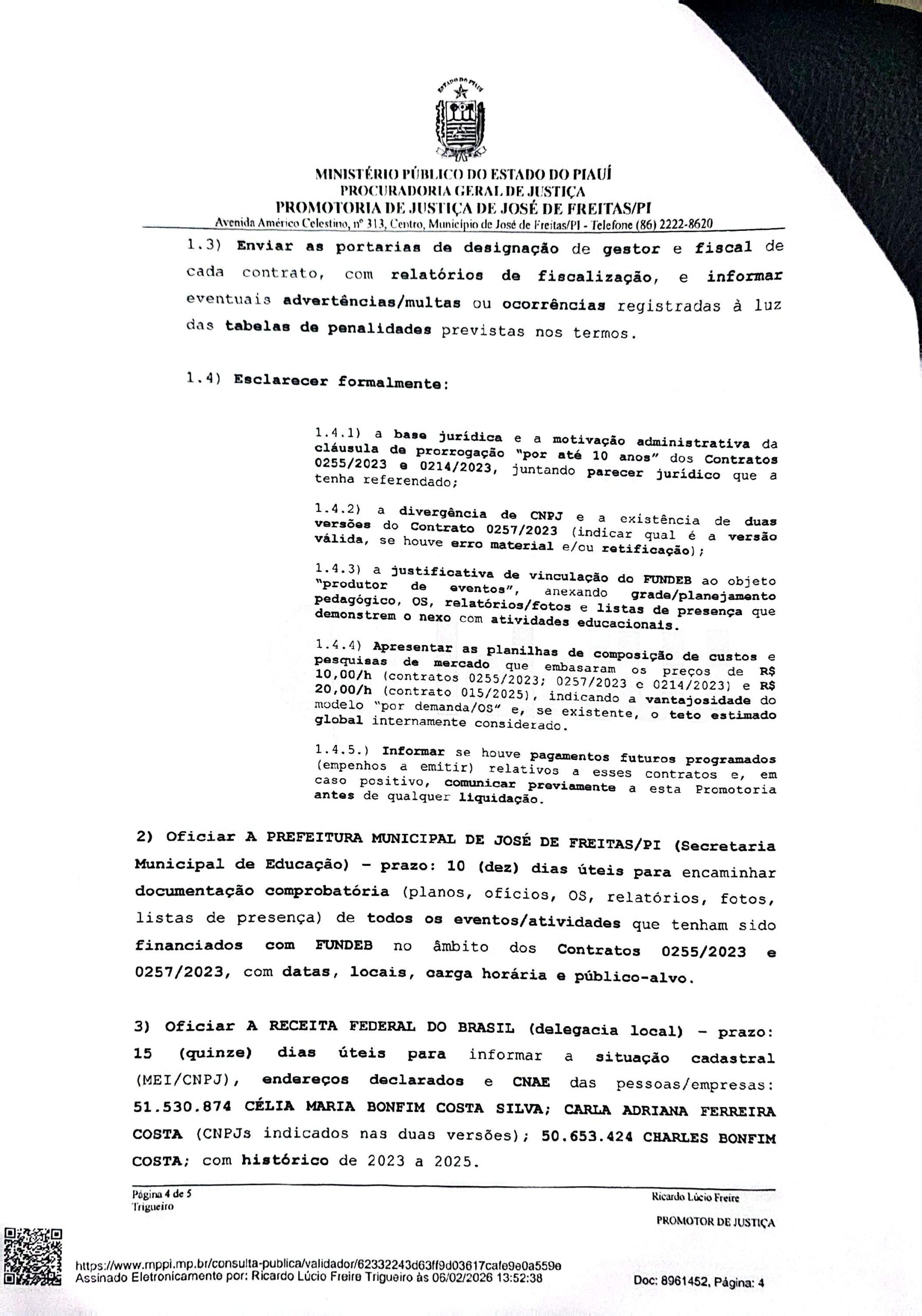 O Ministério Público do Estado do Piauí (MPPI) apura possíveis irregularidades em contratos da Prefeitura de José de Freitas, com foco no uso de empresas de fachada com recursos do FUNDEB. A investigação envolve pessoas ligadas às empresas contratadas, entre elas Célia Maria Bonfim Costa Silva, Carla Adriana Ferreira Costa e Charles Bonfim Costa, com pedido de informações à Receita Federal.